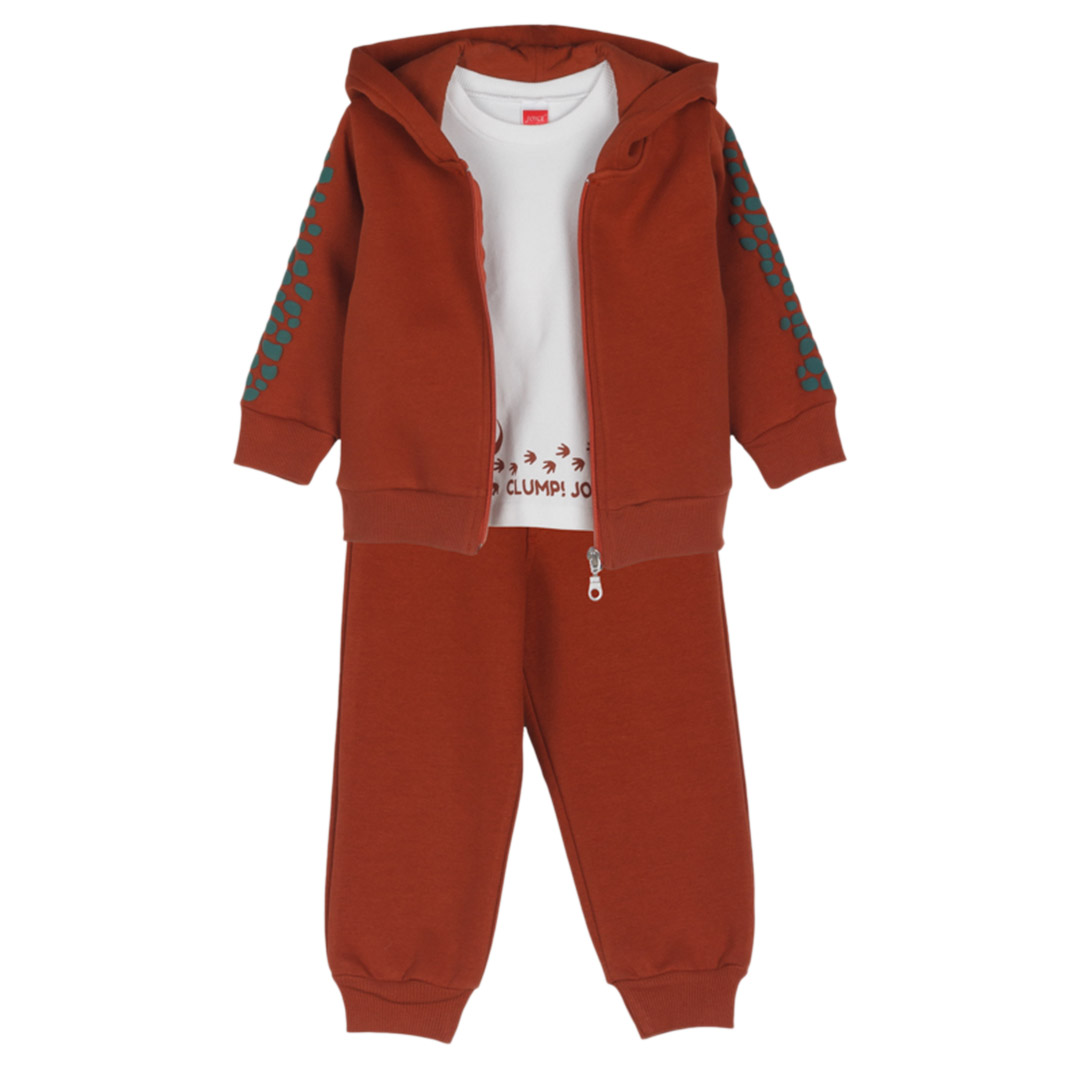 Αυτό το κομψό και πρακτικό αγορίστικο σετ 3 τεμαχίων σε καφέ χρώμα είναι η ιδανική επιλογή για καθημερινές δραστηριότητες αλλά και για πιο χαλαρές εξόδους. Το σετ περιλαμβάνει μια ζακέτα με κουκούλα, μια μακρυμάνικη μπλούζα και μια φόρμα με λάστιχο στο τελείωμα. Η ζακέτα είναι σχεδιασμένη για να προσφέρει άνεση και ζεστασιά, χάρη στο εσωτερικό χνούδι που διατηρεί τη θερμότητα τις πιο δροσερές μέρες. Το μακρυμάνικο μπλουζάκι, ελαφρύ και χωρίς χνούδι, είναι τέλειο για να φορεθεί είτε μόνο του είτε σε συνδυασμό με τη ζακέτα.