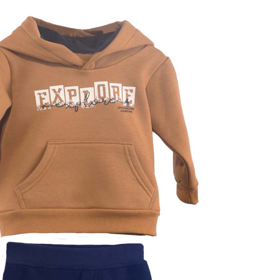 Το σετ φόρμες από την εταιρία Joyce είναι η ιδανική επιλογή για καθημερινή χρήση με το χαρούμενο χρώμα του, καφέ. Αποτελείται από μακρυμάνικη μπλούζα φούτερ με κουκούλα και φόρμα με λάστιχο στο τελείωμα, προσφέροντας ένα έτοιμο, στυλάτο look στα παιδιά σας. Οι δυνατότητες συνδυασμού χρωμάτων και σχεδίων είναι ατελείωτες, δίνοντάς τους την ελευθερία να εκφραστούν με τον δικό τους τρόπο.
