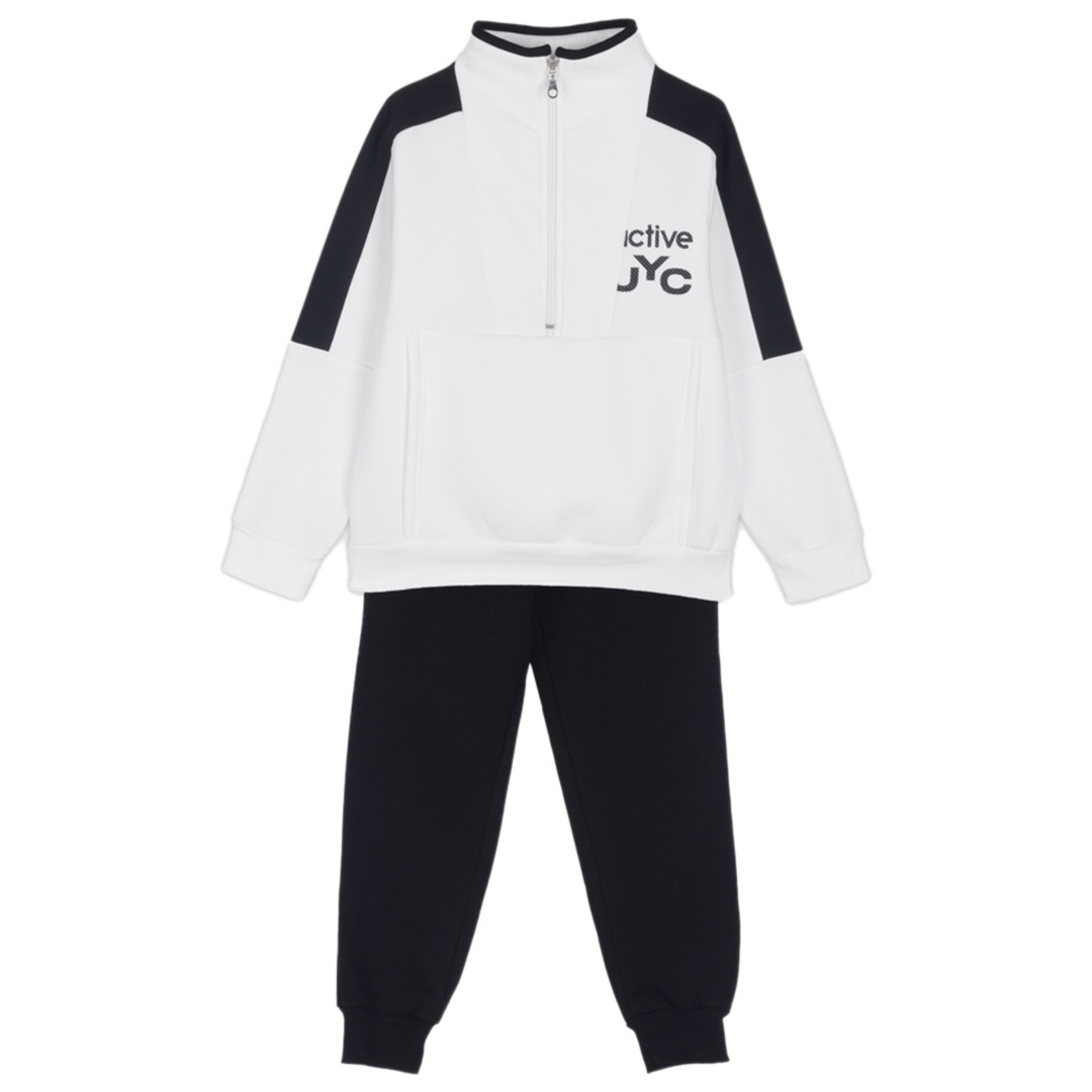 Αυτό το βαμβακερό αγορίστικο σετ σε άσπρο χρώμα είναι η ιδανική επιλογή για ζεστές και άνετες εμφανίσεις στις κρύες ημέρες. Κατασκευασμένο από υψηλής ποιότητας βαμβάκι με εσωτερικό χνούδι, προσφέρει μοναδική αίσθηση απαλότητας και ζεστασιάς. Η μπλούζα διαθέτει ημίψηλο γιακά με φερμουάρ που ανοίγει μέχρι τη μέση, προσφέροντας ευκολία στο ντύσιμο και κομψή εμφάνιση. Οι τσέπες σε στιλ μάρσιπο όχι μόνο ενισχύουν το στυλ, αλλά και προσφέρουν πρακτικότητα για μικρά αντικείμενα.