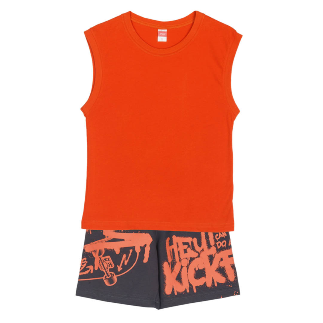 Αυτό το αγορίστικο σετ σε πορτοκαλί χρώμα είναι η ιδανική επιλογή για άνετες και δροσερές καλοκαιρινές εμφανίσεις. Αποτελείται από ένα αμάνικο μπλουζάκι που προσφέρει ελευθερία κινήσεων και δροσιά, ιδανικό για τις ζεστές μέρες. Το ύφασμά του είναι ελαφρύ και μαλακό, εξασφαλίζοντας άνεση όλη μέρα, είτε στις βόλτες είτε στο παιχνίδι.