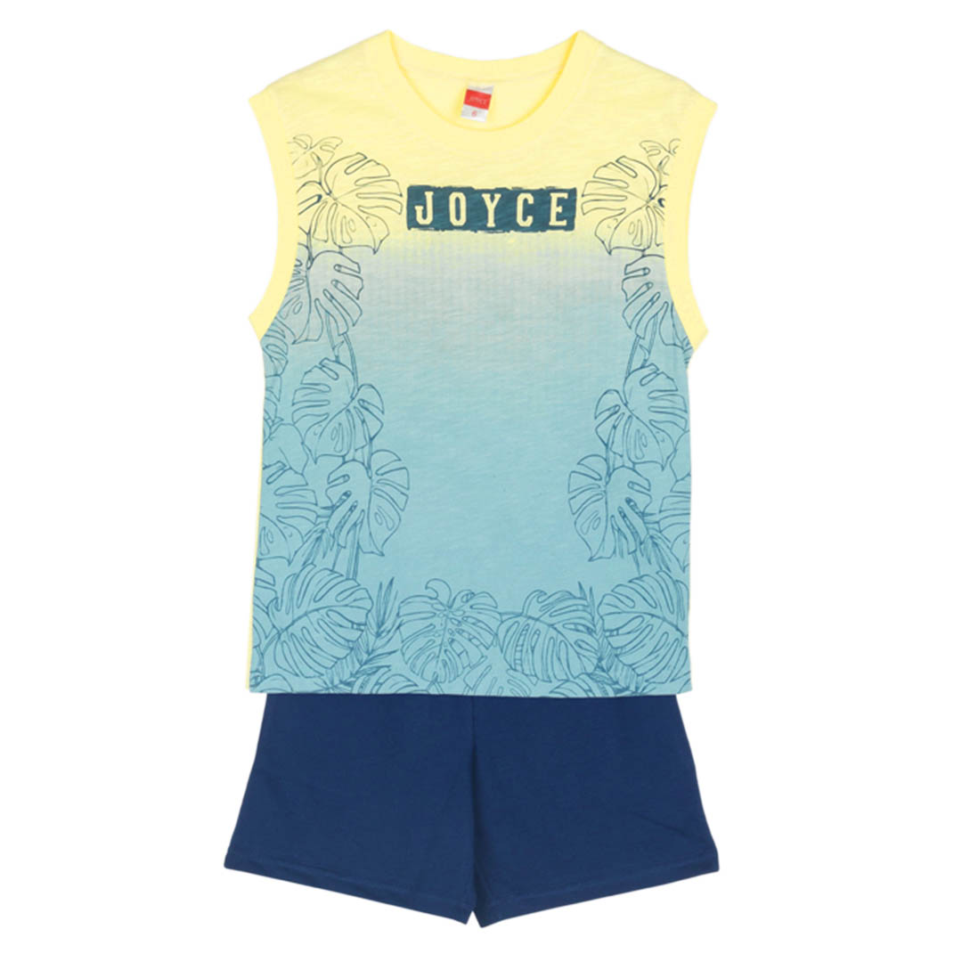 Αυτό το αγορίστικο σετ σε κίτρινο χρώμα είναι η ιδανική επιλογή για άνετες και δροσερές καλοκαιρινές εμφανίσεις. Αποτελείται από ένα αμάνικο μπλουζάκι που προσφέρει ελευθερία κινήσεων και δροσιά, ιδανικό για τις ζεστές μέρες. Το ύφασμά του είναι ελαφρύ και μαλακό, εξασφαλίζοντας άνεση όλη μέρα, είτε στις βόλτες είτε στο παιχνίδι.