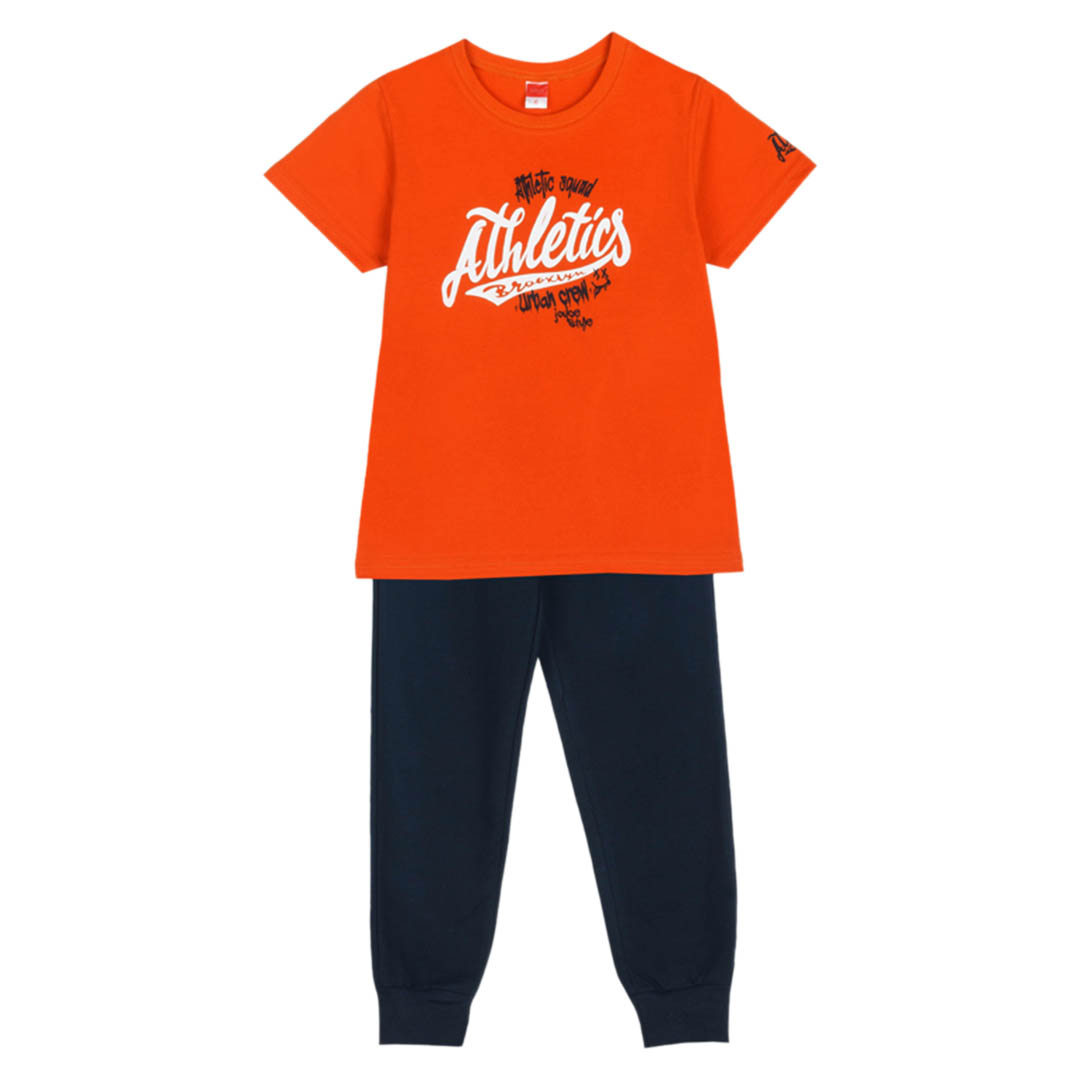 Αυτό το αγορίστικο σετ σε πορτοκαλί χρώμα είναι η ιδανική επιλογή για άνεση και στυλ όλες τις ώρες της ημέρας. Περιλαμβάνει βαμβακερή κοντομάνικη μπλούζα σε απλή, διαχρονική γραμμή που προσφέρει ελευθερία κινήσεων και ευχάριστη αίσθηση στο σώμα. Το ύφασμα είναι χωρίς χνούδι, μαλακό και φιλικό προς το δέρμα, ιδανικό για καθημερινή χρήση ή χαλαρές εξόδους.
