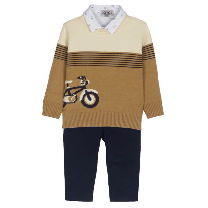 Κομψό και άνετο παιδικό σετάκι 3 τεμαχίων σε καφέ χρώμα , ιδανικό για ιδιαίτερες εμφανίσεις αλλά και για καθημερινή χρήση. Το σετ περιλαμβάνει πουλόβερ με διακριτικό ριγέ σχέδιο, πουκάμισο για ολοκληρωμένο και προσεγμένο look, καθώς και υφασμάτινο παντελόνι που προσφέρει άνεση και στυλ.