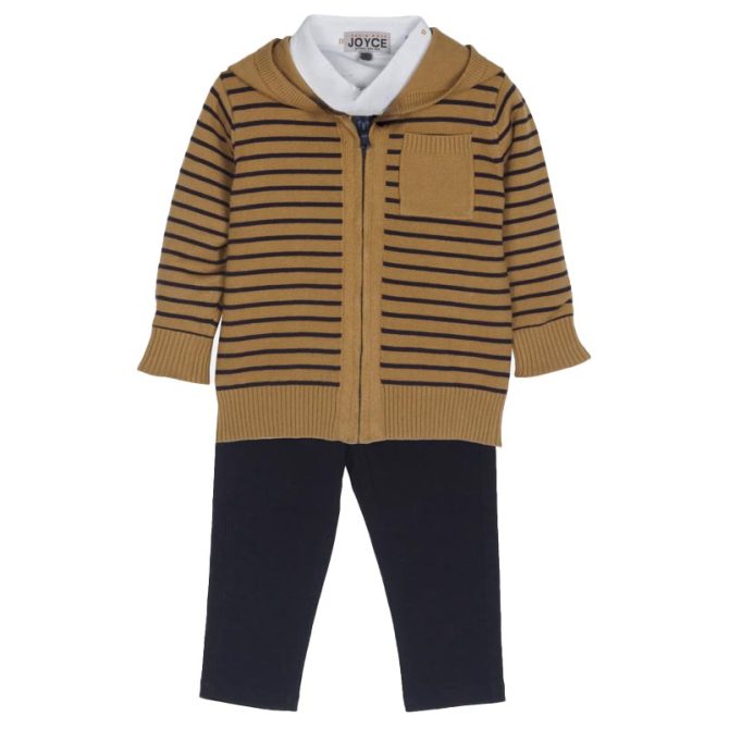Κομψό και άνετο παιδικό σετάκι 3 τεμαχίων σε καφέ χρώμα , ιδανικό για ιδιαίτερες εμφανίσεις αλλά και για καθημερινή χρήση. Το σετ περιλαμβάνει ζακετάκι με φερμουάρ και διακριτικό ριγέ σχέδιο, πουκάμισο για ολοκληρωμένο και προσεγμένο look, καθώς και υφασμάτινο παντελόνι που προσφέρει άνεση και στυλ.