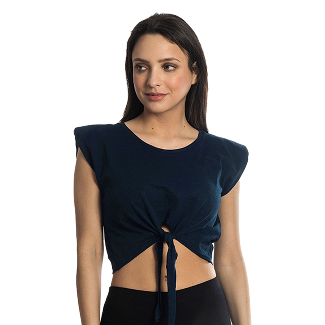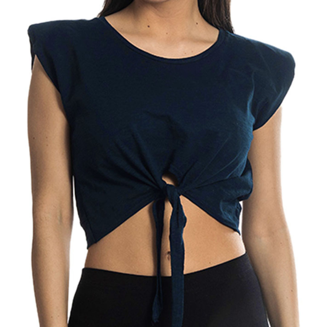 Αναβάθμισε το casual στυλ σου με αυτό το μοντέρνο crop top σε μπλε χρώμα. Είναι κατασκευασμένο από απαλό βαμβάκι για άνεση και ευκολία στην καθημερινή χρήση. Διαθέτει βάτες στους ώμους που χαρίζουν δομημένη γραμμή και πιο εντυπωσιακή σιλουέτα, ενώ το δέσιμο μπροστά προσθέτει θηλυκότητα και στυλ. Ιδανικό για σπορ εμφανίσεις αλλά και για streetwear look.
