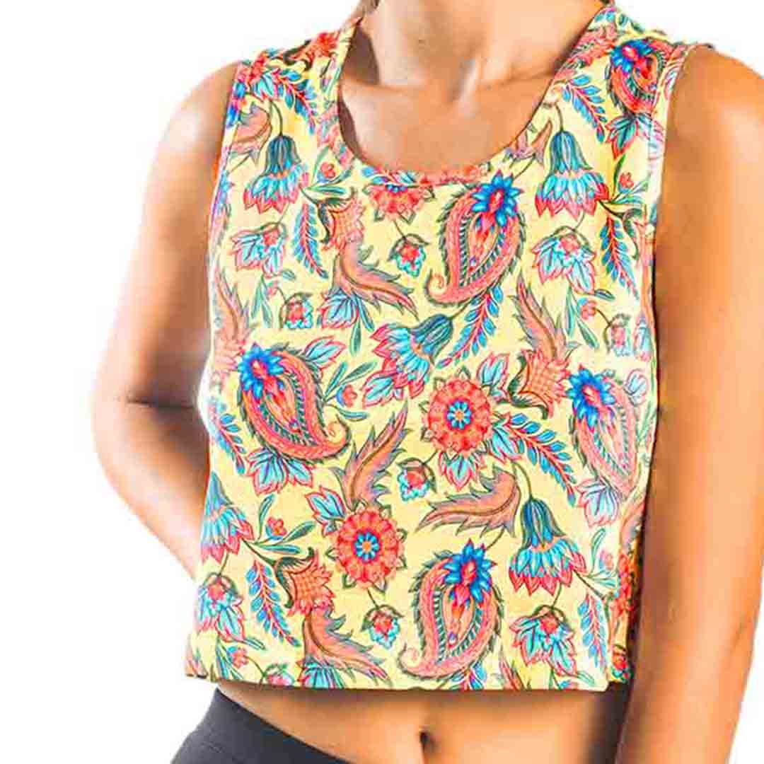 Αυτό το γυναικείο βαμβακερό crop top σε κίτρινο χρώμα συνδυάζει άνεση και στυλ με τον πιο δροσερό τρόπο. Κατασκευασμένο από απαλό βαμβάκι, χαρίζει ευχάριστη αίσθηση στο δέρμα και ιδανική εφαρμογή για τις ζεστές μέρες. Το εντυπωσιακό πολύχρωμο μοτίβο με λουλούδια και paisley λεπτομέρειες δίνει στο outfit ζωντάνια και θηλυκότητα, κάνοντάς το μοναδικό κομμάτι για κάθε casual εμφάνιση. Με άνετη γραμμή και μοντέρνο μήκος, ταιριάζει τέλεια με ψηλόμεσα παντελόνια, σορτσάκια ή κολάν. Ένα must-have κομμάτι για όσες αγαπούν τα παιχνιδιάρικα prints και την άνεση στην καθημερινότητά τους.