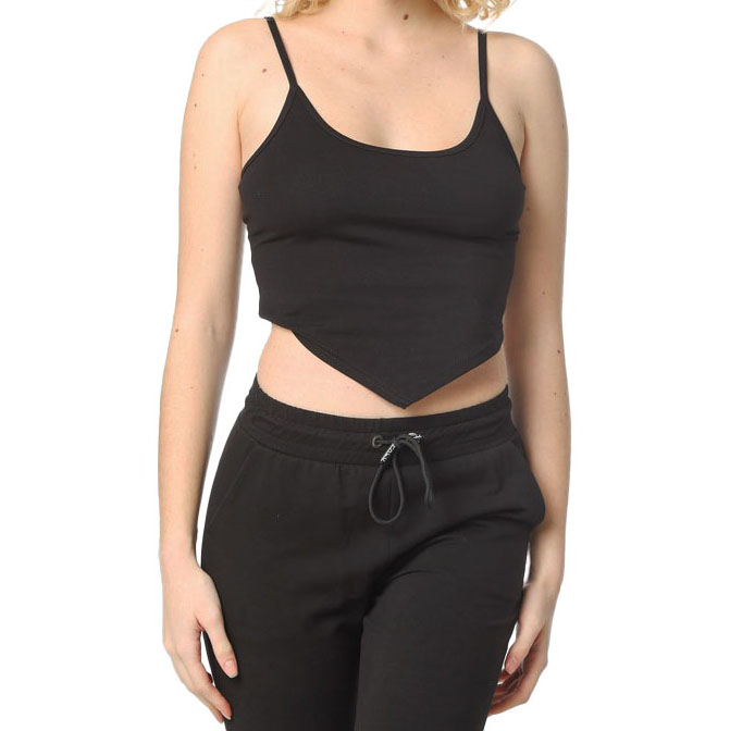 Αυτό το μαύρο γυναικείο μπλουζάκι είναι αμάνικο με λεπτές τιράντες και στενή εφαρμογή, αναδεικνύοντας τη σιλουέτα. Είναι κοντό, τύπου crop top, με τελείωμα σε μυτερή γραμμή μπροστά που του δίνει μοντέρνο και ιδιαίτερο στυλ. Ένα απλό αλλά ταυτόχρονα κομψό κομμάτι, ιδανικό για καθημερινές εμφανίσεις ή για πιο casual looks, που μπορεί να συνδυαστεί εύκολα με τζιν, σορτσάκια ή φόρμες.