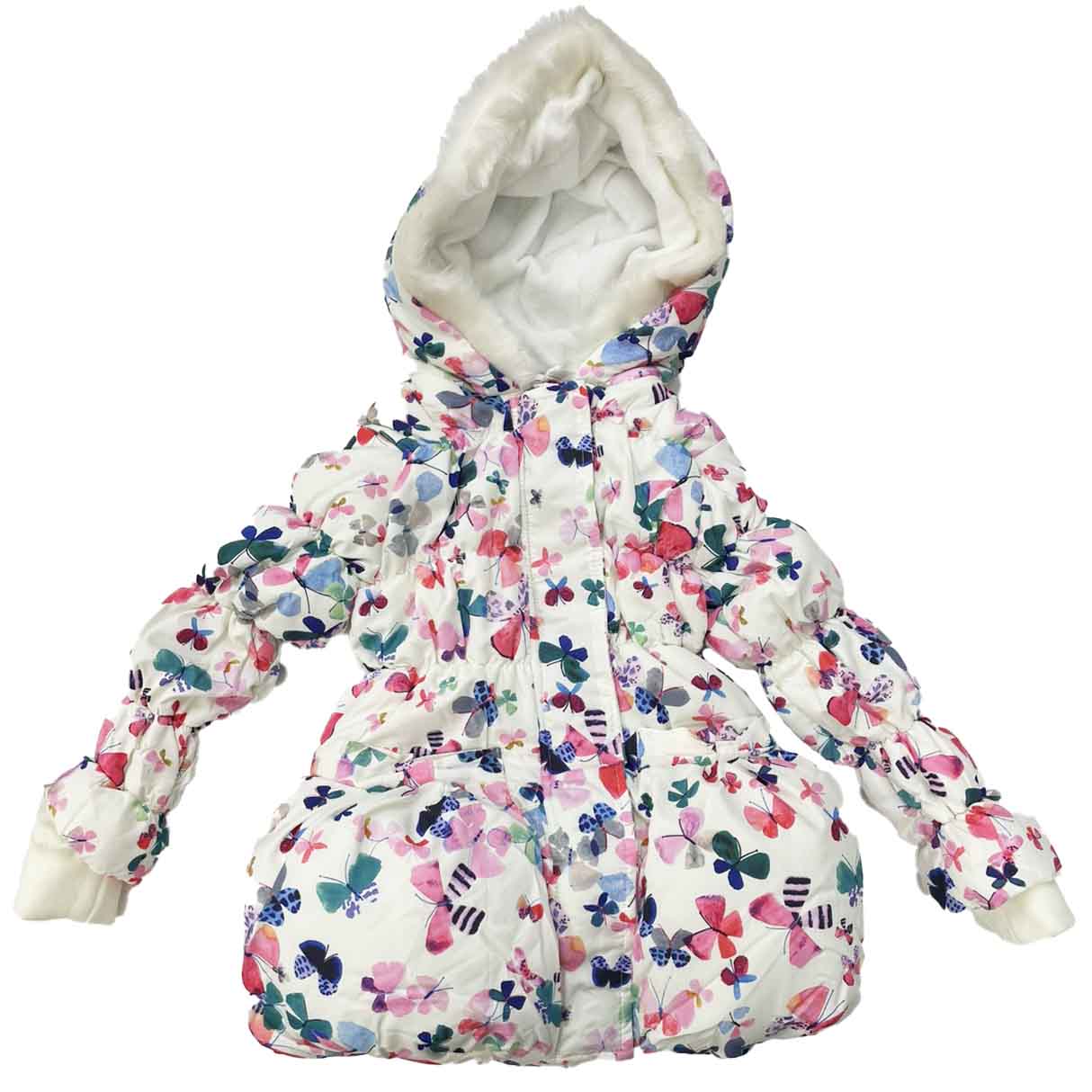 Ένα υπέροχο παιδικό μπουφάν για κορίτσια σε άσπρο χρώμα , ιδανικό για τις κρύες μέρες, που συνδυάζει ζεστασιά, άνεση και μοναδικό στιλ. Κατασκευασμένο από υψηλής ποιότητας υλικά, προσφέρει εξαιρετική μόνωση και απαλό άγγιγμα χάρη στη χνουδωτή επένδυση στο εσωτερικό του. Το εξωτερικό του είναι διακοσμημένο με χαριτωμένες πολύχρωμες πεταλούδες, χαρίζοντας χαρούμενη και παιχνιδιάρικη εμφάνιση. Η κουκούλα διαθέτει απαλή γούνα για επιπλέον προστασία από το κρύο, ενώ τα λάστιχα στα μανίκια εξασφαλίζουν καλύτερη εφαρμογή και άνεση. Κλείνει με φερμουάρ για εύκολη χρήση και είναι ιδανικό για καθημερινές βόλτες, σχολείο ή δραστηριότητες εκτός σπιτιού. Ένα μπουφάν που κάθε μικρή θα λατρέψει!