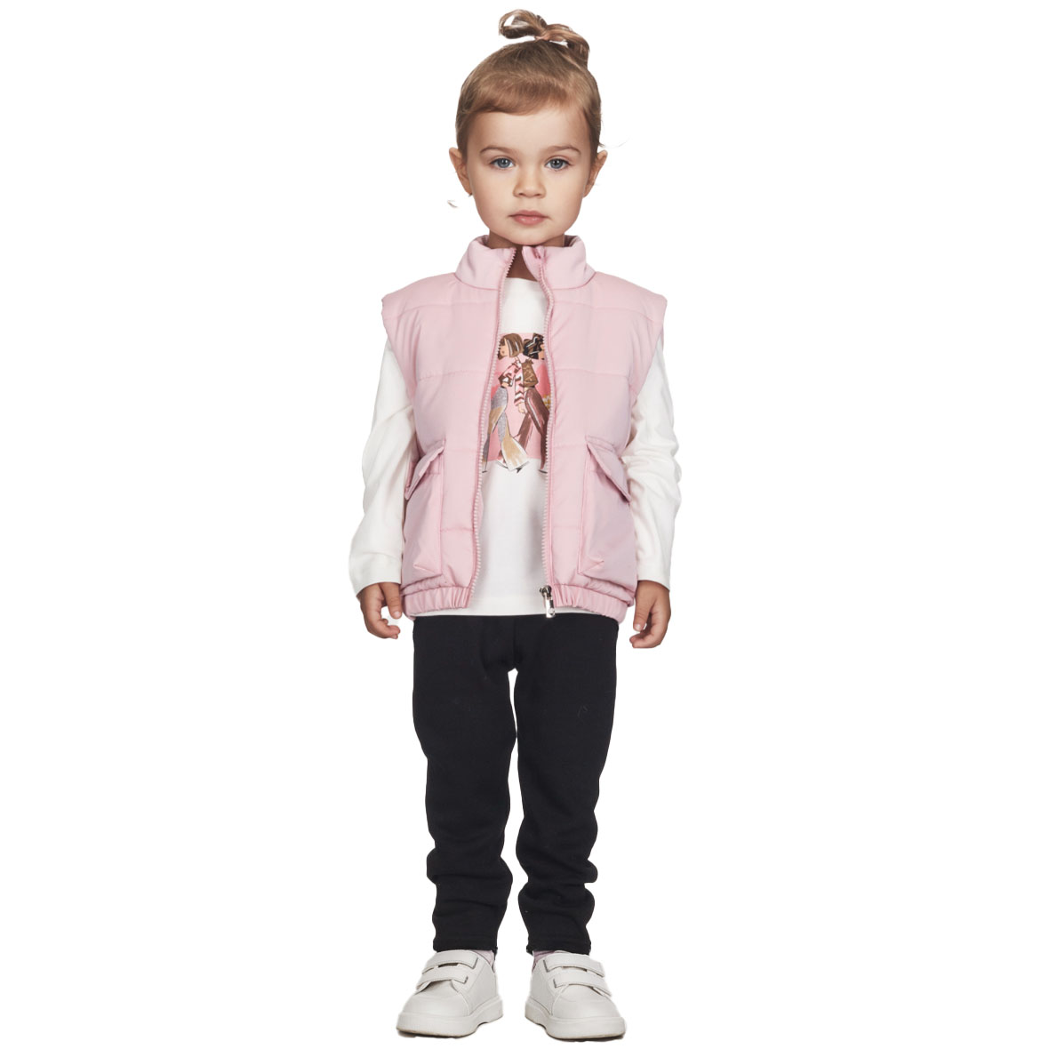 Παιδικό σετάκι 3 τεμαχίων, ιδανικό για άνετες και κομψές καθημερινές εμφανίσεις. Το σετ αποτελείται από ένα αμάνικο καπιτονέ γιλέκο, μία μακρυμάνικη βαμβακερή μπλούζα χωρίς χνούδι και ένα βαμβακερό κολάν με χνούδι. Το γιλέκο διαθέτει απαλή επένδυση, όρθιο γιακά, κλείσιμο με φερμουάρ και πρακτικές τσέπες, προσφέροντας ζεστασιά χωρίς να περιορίζει την κίνηση. Η μπλούζα έχει χαριτωμένο τύπωμα στο μπροστινό μέρος και μαλακή υφή για άνεση όλη μέρα. Το κολάν διαθέτει ελαστικότητα για τέλεια εφαρμογή και άνετη αίσθηση. Ένα ολοκληρωμένο σετάκι που συνδυάζει στυλ, πρακτικότητα και άνεση, ιδανικό για βόλτες, παιχνίδι και καθημερινή χρήση.