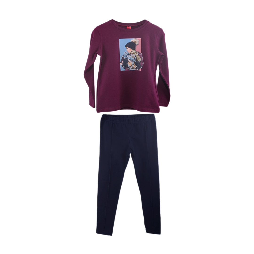 Ένα εξαιρετικά ποιοτικό κοριτσίστικο σετ με μακρυμάνικο μπλουζάκι και μακρύ κολάν σε μωβ χρώμα, κατασκευασμένο από 95% βαμβάκι και 5% ελαστίνη. Το βαμβακερό ύφασμα αγκαλιάζει απαλά το δέρμα, ενώ η προσθήκη ελαστίνης προσφέρει την απαραίτητη ελαστικότητα για άνετη κίνηση.