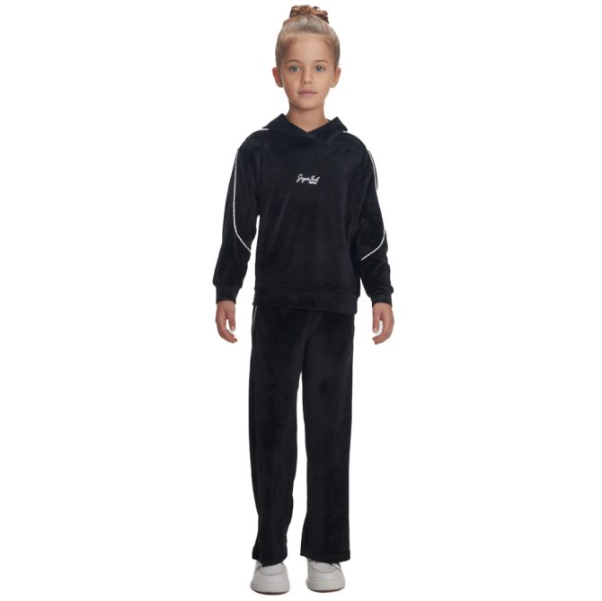 Ένα υπέροχο παιδικό βελούδινο σετάκι σε μαύρο χρώμα που συνδυάζει άνεση, κομψότητα και πρακτικότητα για κάθε στιγμή της ημέρας. Είναι κατασκευασμένο από μαλακό, απαλό βελούδο χωρίς χνούδι στο εσωτερικό, ώστε να παραμένει ελαφρύ και ευχάριστο στο σώμα. Η μπλούζα διαθέτει κουκούλα που προσφέρει στυλ και επιπλέον ζεστασιά, ενώ οι διακριτικές λεπτομέρειες στις ραφές αναδεικνύουν την ποιοτική του αισθητική. Το παντελόνι έχει γραμμή καμπάνα, χαρίζοντας μοντέρνα εμφάνιση και άνεση στις κινήσεις. Ένα ιδανικό σετ για καθημερινή χρήση, βόλτες ή σχολικές δραστηριότητες, που προσφέρει ολοκληρωμένο look με μοναδική απαλότητα και στιλ.Πλένεται εύκολα στο πλυντήριο στους 40°C, διατηρώντας την ποιότητά του αναλλοίωτη.