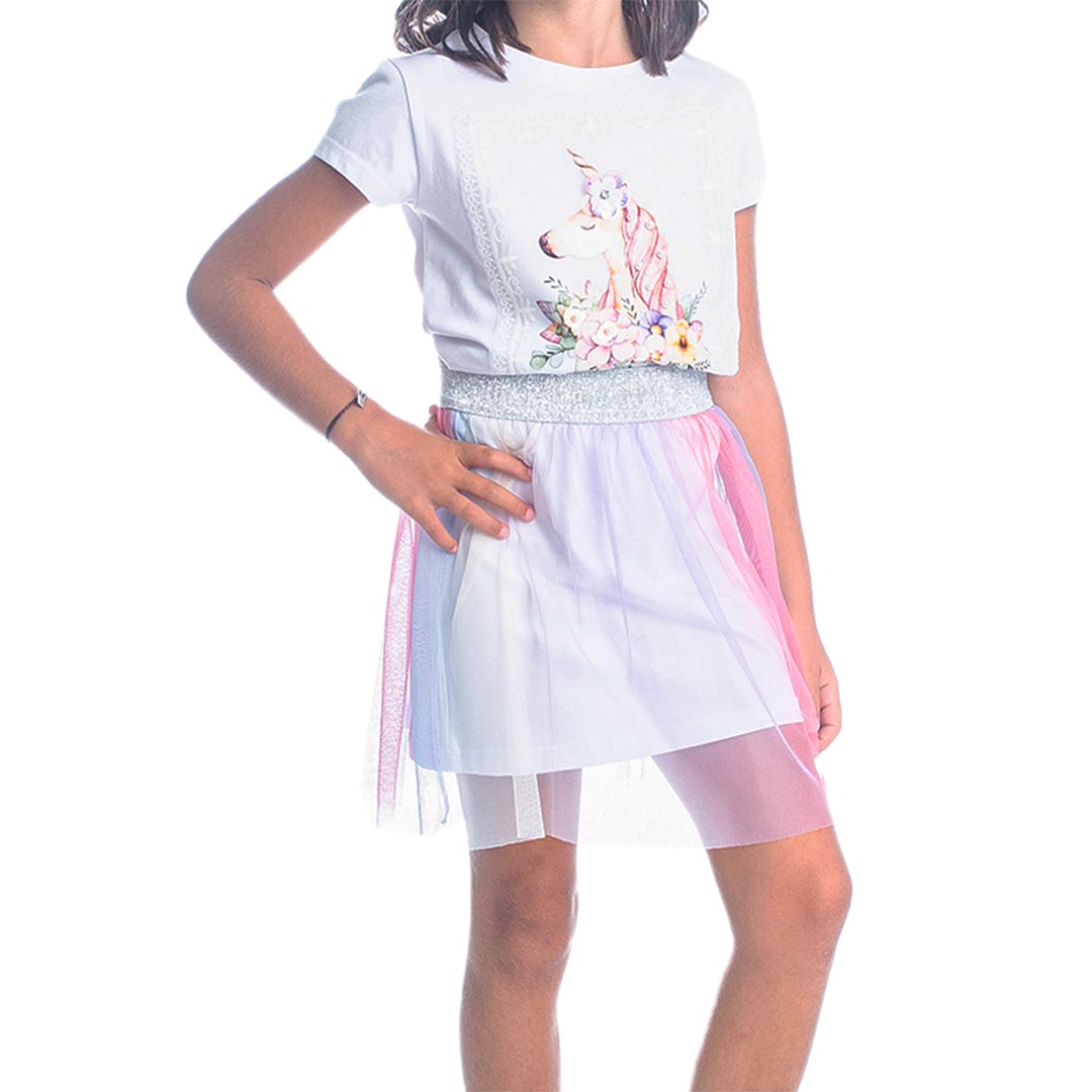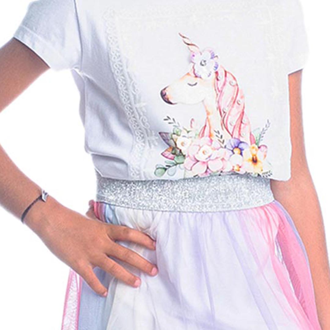 Αυτό το κοριτσίστικο καλοκαιρινό σετ σε άσπρο χρώμα συνδυάζει ρομαντικό στυλ και άνεση, ιδανικό για δροσερές και κομψές εμφανίσεις. Αποτελείται από μια αέρινη φούστα με εξωτερικό στρώμα από τούλι, που χαρίζει όγκο και κίνηση, προσφέροντας ένα παιχνιδιάρικο και κοριτσίστικο look. Η φούστα διαθέτει ελαστική μέση για άνετη εφαρμογή, επιτρέποντας ελευθερία κινήσεων.