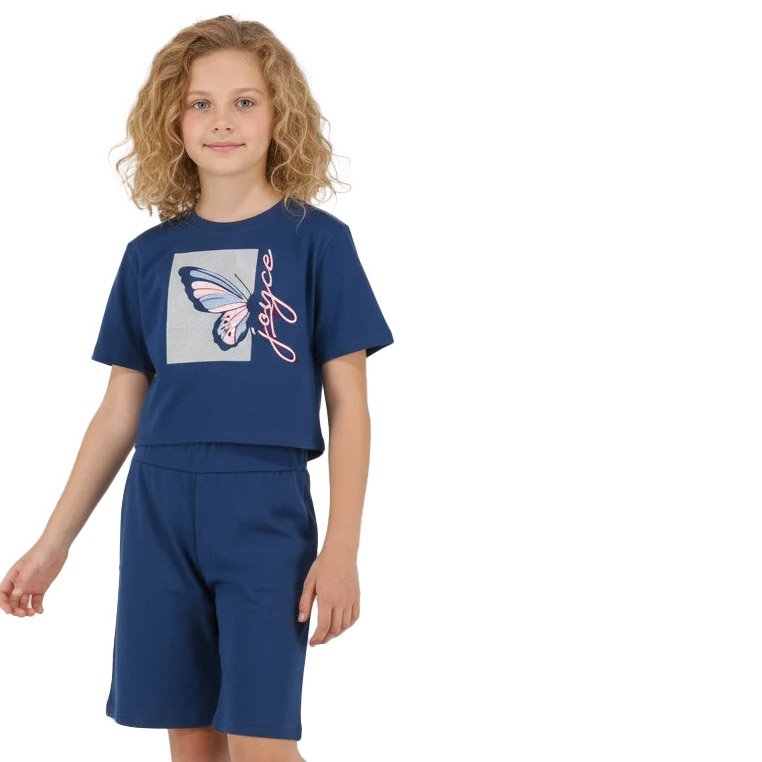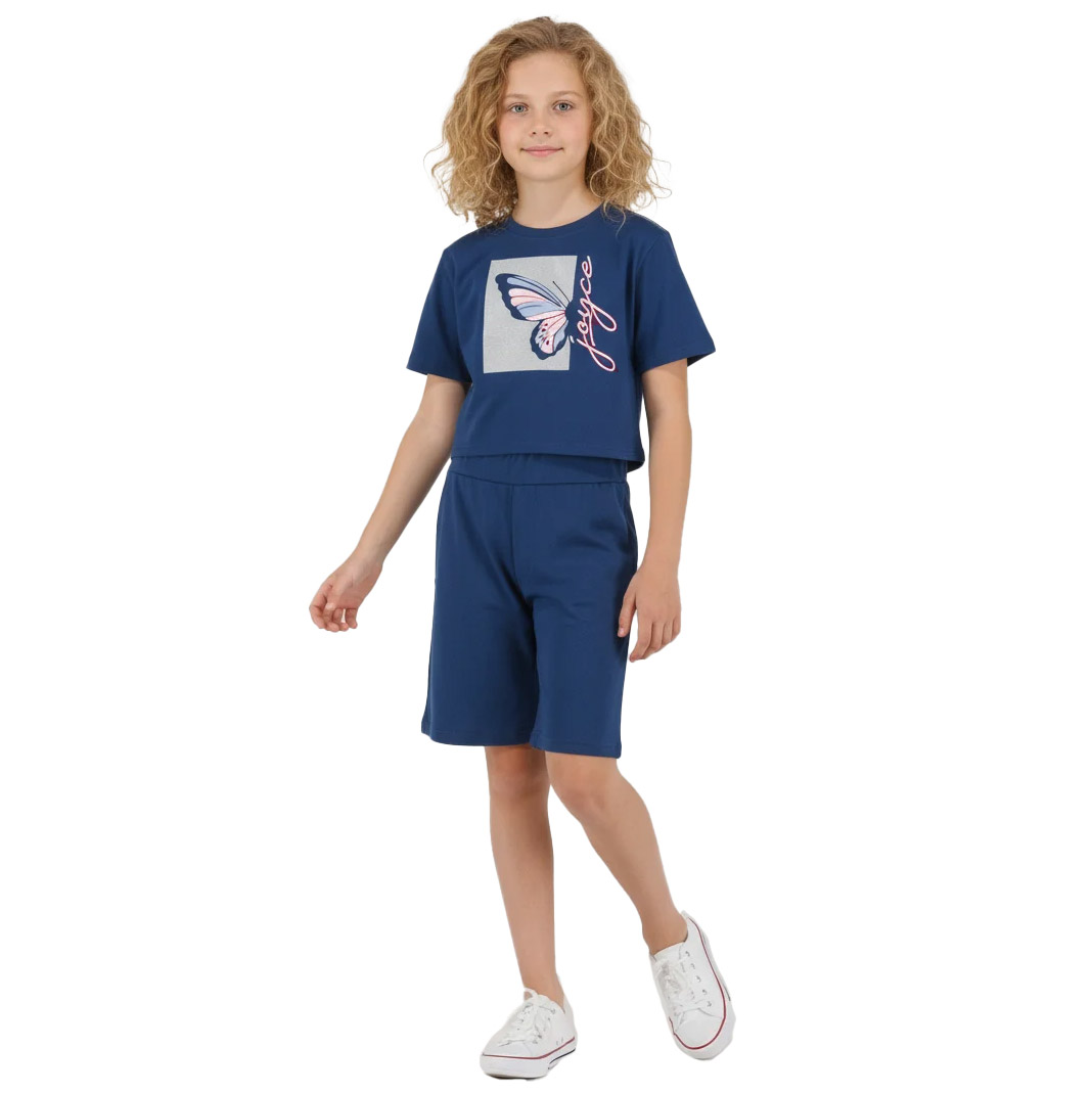 Αυτό το κοριτσίστικο βαμβακερό σετ συνδυάζει άνεση και σύγχρονο στιλ, ιδανικό για καθημερινές εμφανίσεις με ξεχωριστό χαρακτήρα. Αποτελείται από κοντομάνικο μπλουζάκι σε μπλε χρώμα με εντυπωσιακό τύπωμα πεταλούδας στο μπροστινό μέρος, που χαρίζει ρομαντική και girly διάθεση. Το μπλουζάκι έχει άνετη, μοντέρνα γραμμή που εφαρμόζει όμορφα χωρίς να περιορίζει τις κινήσεις.