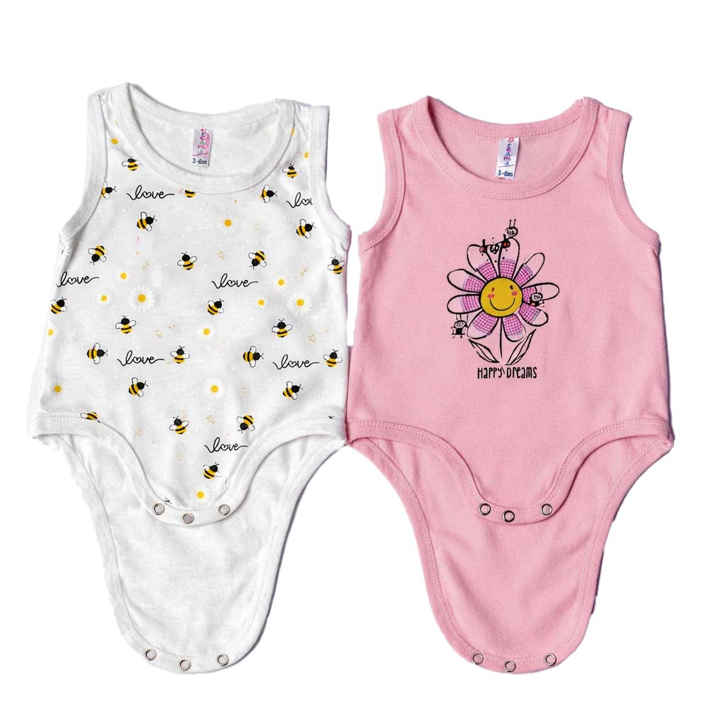 Σετ από βαμβακερά αμάνικα βρεφικά ζιπουνάκια σε ροζ και άσπρο χρώμα, σχεδιασμένα για άνεση και πρακτικότητα στις καθημερινές στιγμές του μωρού. Κατασκευασμένα από απαλό, φιλικό προς το ευαίσθητο βρεφικό δέρμα βαμβάκι, προσφέρουν σωστή διαπνοή και άνετη εφαρμογή. Διαθέτουν χαριτωμένα σχέδια και παιχνιδιάρικα χρώματα, ενώ το κούμπωμα με τρουκς στο κάτω μέρος διευκολύνει την αλλαγή πάνας. Ιδανικά για τους ζεστούς μήνες, φοριούνται μόνα τους ή ως εσώρουχο, αποτελώντας βασικό κομμάτι της βρεφικής γκαρνταρόμπας.