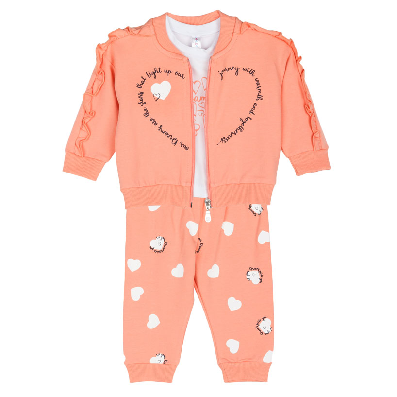 Το βρεφικό βαμβακερό σετ 3 τεμαχίων για κορίτσια από την εταιρία Dreams by Joyce σε πορτοκαλί χρώμα είναι η ιδανική επιλογή για όλους τους μήνες του χρόνου. Αυτό το σετ προσφέρει άνεση, στυλ και πρακτικότητα στην καθημερινή ντουλάπα των παιδιών.