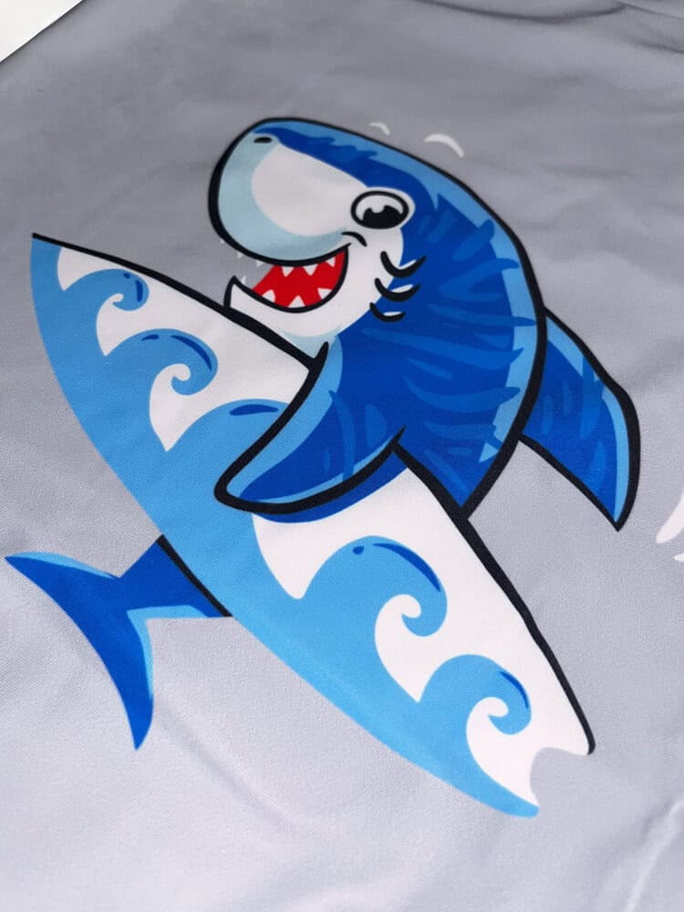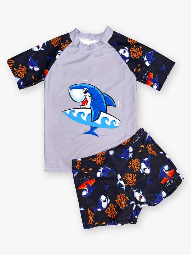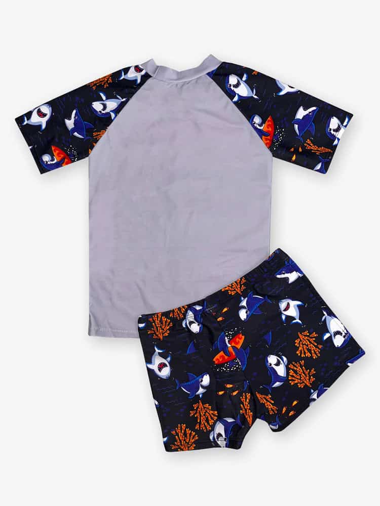 - Παιδικό σετ μαγιό μπλούζα και σορτς με αντιηλιακή προστασία και σχέδια shark.