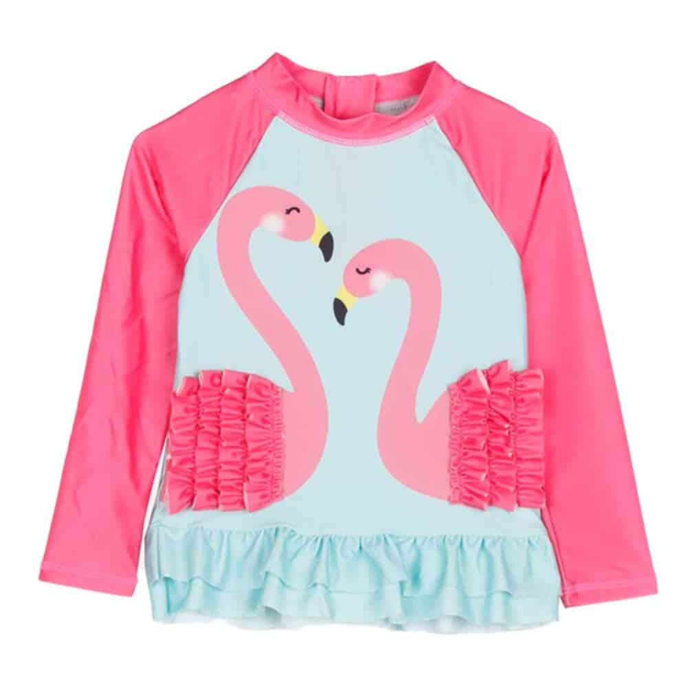 Ζωντανό και παιχνιδιάρικο, αυτό το παιδικό κοριτσίστικο μαγιό σε έντονο φούξ χρώμα συνδυάζει στυλ και προστασία. Αποτελείται από ένα μακρυμάνικο μπλουζάκι και σορτσάκι, ιδανικό για τις μικρές που περνούν πολλές ώρες στον ήλιο. Το διασκεδαστικό σχέδιο με φλαμίνγκο προσθέτει μια εξωτική και καλοκαιρινή πινελιά που θα λατρέψουν τα παιδιά.