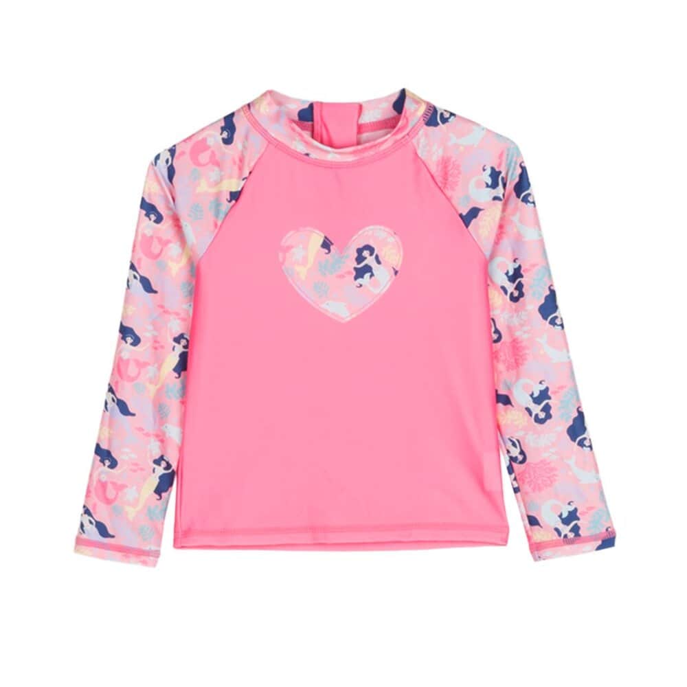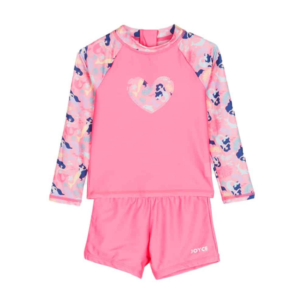 Ζωντανό και παιχνιδιάρικο, αυτό το παιδικό κοριτσίστικο μαγιό σε έντονο φούξ χρώμα συνδυάζει στυλ και προστασία. Αποτελείται από ένα μακρυμάνικο μπλουζάκι και σορτσάκι, ιδανικό για τις μικρές που περνούν πολλές ώρες στον ήλιο. Το διασκεδαστικό σχέδιο με γοργόνες προσθέτει μια εξωτική και καλοκαιρινή πινελιά που θα λατρέψουν τα παιδιά.