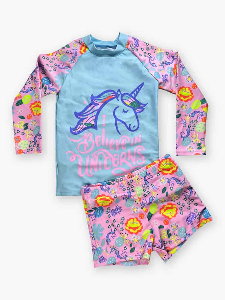 - Παιδικό σετ μαγιό μπλούζα και σλιπ με αντιηλιακή προστασία και σχέδια unicorn.